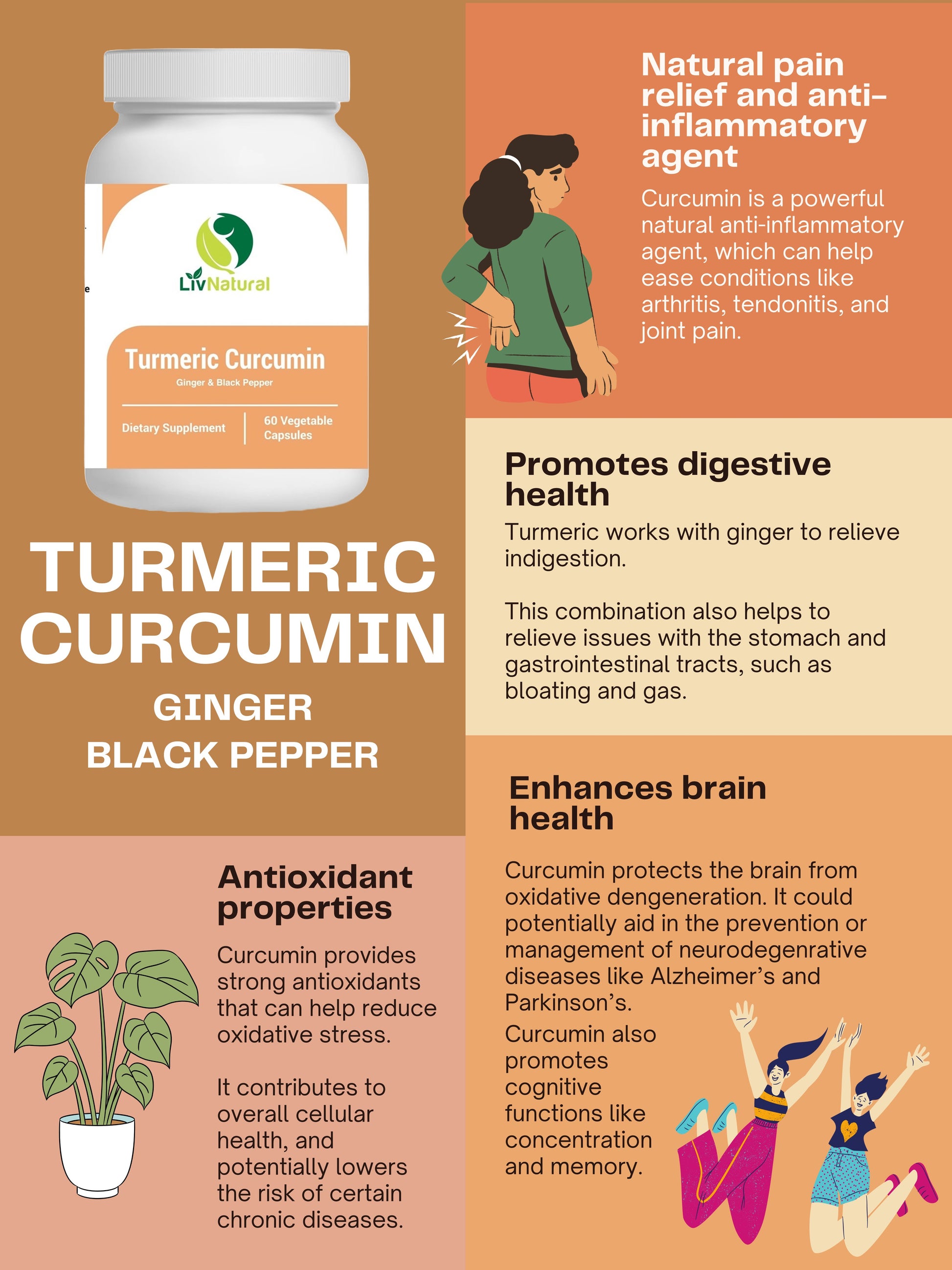 Turmeric Curcumin has powerful natural pain relief and anti-inflammatory benefits for arthritis, tendonitis, and joint pain etc. This 100% natural supplement boosts nutrient absorption and bioavailability, providing digestive health and comfort. Manufactured in the USA with strict FDA quality control.